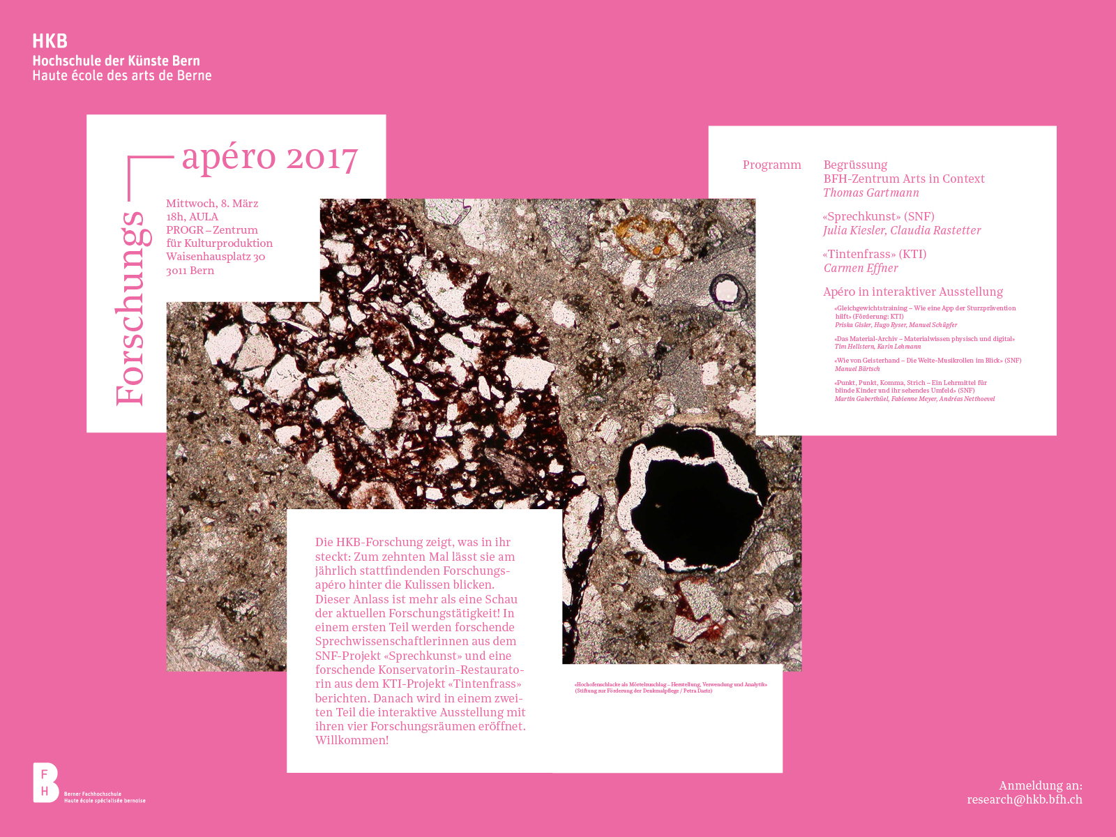 Die HKB-Forschung zeigt, was in ihr steckt: Zum zehnten Mal lässt sich am jährlich stattfindenden Forschungsapéro hinter die Kulissen blicken. Dieser Anlass ist mehr als eine Schau der aktuellen Forschungstätigkeit! In einem ersten Teil werden forschende Sprechwissenschaftlerinnen aus dem SNF-Projekt «Sprechkunst» und eine forschende Konservatorin-Restauratorin aus dem KTI-Projekt «Tintenfrass» berichten. Danach wird in einem zweiten Teil die interaktive Ausstellung mit ihren vier Forschungsräumen eröffnet. Willkommen!