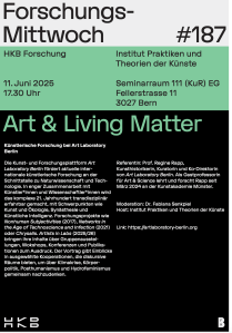 Leider fällt der Forschungsmittwoch vom 11. Juni 2025 krankheitshalber aus und is abgesagt. Archiv Text: Gerne laden wir ein zum Forschungs-Mittwoch des Instituts Praktiken und Theorien der Künste am 11. Juni, um 17:30 Uhr. Wir freuen uns sehr, dass Prof.