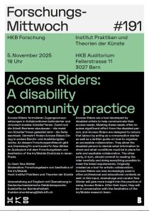 Das HKB Institut Praktiken und Theorien der Künste – IPTK lädt ein zum ForschungsMittwoch im Rahmen des SNF-Projekts „Ästhetiken des Im/mobilen“ 📅 5. November 2025 | 🕕 18:00 Uhr | 📍 HKB Auditorium, Fellerstrasse 11, Bern Unter dem Titel „Access Riders: