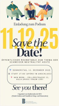 Im Anschluss an das IPTK-Kolloquium vom 11.12.2025 wird eine Podiumsdiskussion zum Thema der Schweizer Neutralität heute im Rahmen des Moduls «Denken und Handeln in Krisenzeiten» stattfindet, die von BFH-Studierenden organisiert wird. Wir freuen uns über zahlreiches Erscheinen! 📅 11.12.2025⏰ 17:00 📍HKB, Grosse Aula (Raum 155)