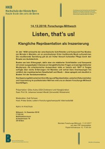 Listen, that’s us! Klangliche Repräsentation als Inszenierung Forschungs-Mittwoch am 14.12.2016 um 17:00 Uhr aus dem FSP Intermedialität. Mit Apéro im Anschluss. Präsentation: Gilles Aubry (GSA-Doktorand und Klangkünstler) Gast: Prof. Dr. Johannes Ismaiel-Wendt (Universität Hildesheim) Moderation: Andi Schoon Multifunktionsraum, Schwabstrasse 10, 3018