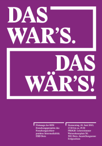 Das war’s. Das wär’s! Finissage der BFH-Forschungsprojekte des FSP Intermedialität In den vergangenen Jahren hat der FSP Intermedialität Forschungsprojekte in verschiedenen Richtungen durchgeführt. Wir haben uns mit dem Begriff des Dokumentarischen im zeitgenössischen Theater beschäftigt, haben Kippmomente im künstlerischen Produktionsprozess